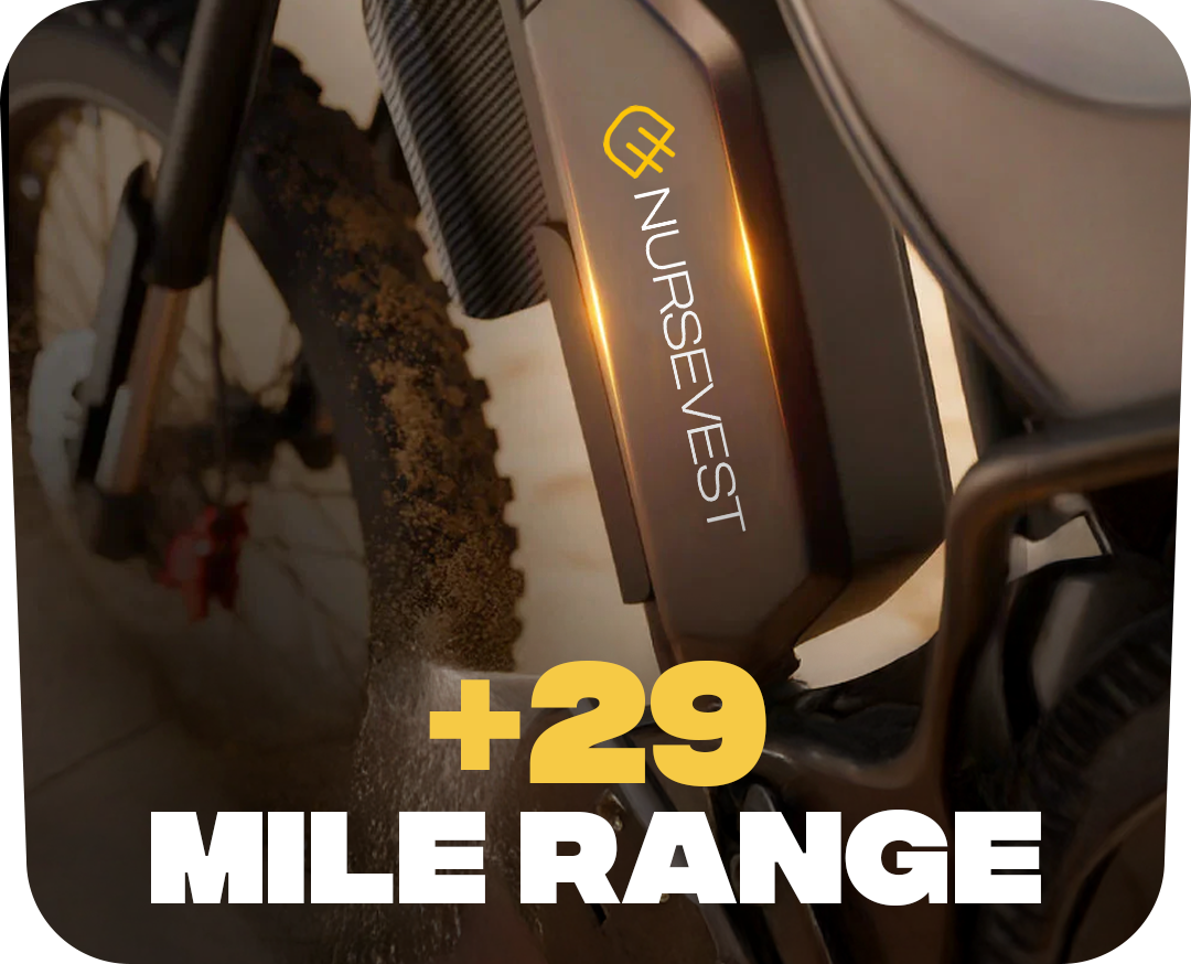 The NURSEVEST PRO is equipped with a 60V/32Ah battery, delivering an impressive real-world range of up to 29 miles on a single charge. Whether you're commuting to work or exploring off-road trails, you can ride with confidence — no need to worry about running out of power.